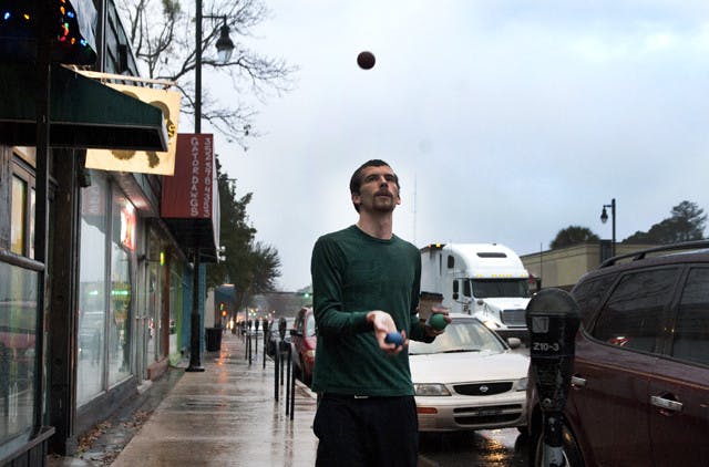 Santa Fe student Graham Smith, 24, juggles, walks and drinks coffee in the rain while juggling on Wednesday afternoon.