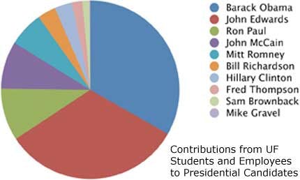 UF students and faculty have given more than $15,000 so far to candidates for the 2008 presidential election, with about 70 percent of the funds going to Democrats.