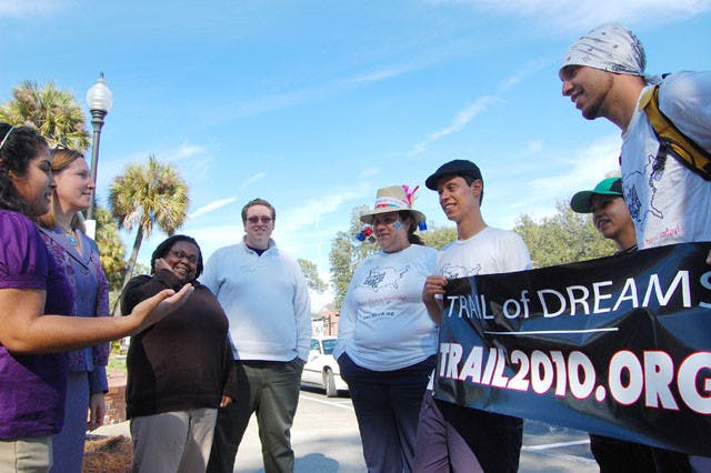 Four students from Miami Dade College pass through Gainesville on a hike from Miami to Washington, D.C.