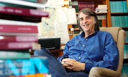 In a small production room in ivy-covered Bryan Hall, a moppy-haired man clad in a blue long-sleeved collared shirt and dark jeans appears on eight different screens.