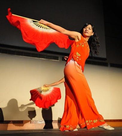 Out of the darkness came a bejeweled purple and yellow dragon, snaking to the syncopated beat of the percussion.