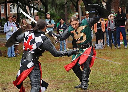 Flashing sparks and clanking swords attracted about 200 people to a scene typical of the Middle Ages on the Plaza of the Americas on Wednesday afternoon.