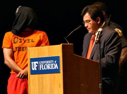 In his first appearance at a university since resigning in August, former U.S. Attorney General Alberto Gonzales was met at UF on Monday with a mixture of cheers, boos and scattered interruptions by protesters, two of whom were arrested.