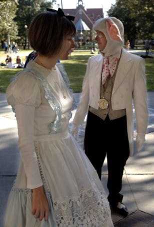 A smartly dressed white rabbit walked across the Plaza of the Americas and pulled out his gold pocket watch to check the time.