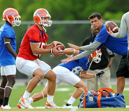 Those on hand to watch UF's spring practices in the past week have been treated to a bizarre sight: quarterbacks Tim Tebow and John Brantley taking snaps under center.