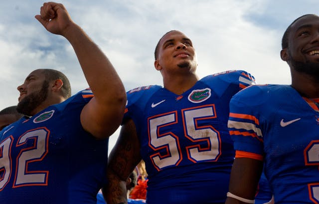 Running onto Florida Field for the last time, Mike Pouncey hid his face in his helmet.