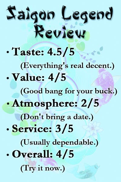 Drew: Tagged down behind enemy lines, you might not expect to find a delicious plate of crispy egg noodles. But that’s exactly what you’ll encounter at regionally famous Saigon Legend, located on 1228 W. University Ave. This unassuming Vietnamese eatery doesn’t plaster its rooms with glow-in-the-dark tables and new-age bullshit; instead it brings a nice medley of pork, chicken and Asian vegetables that will delight the senses and set your taste buds ablaze.