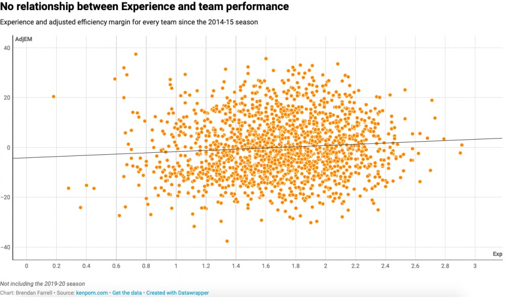 KenPom’s adjusted efficiency margin (AdjEM) is simply a team’s adjusted offensive efficiency minus its adjusted defensive efficiency. There is not much of a relationship between a team’s AdjEM and its experience.