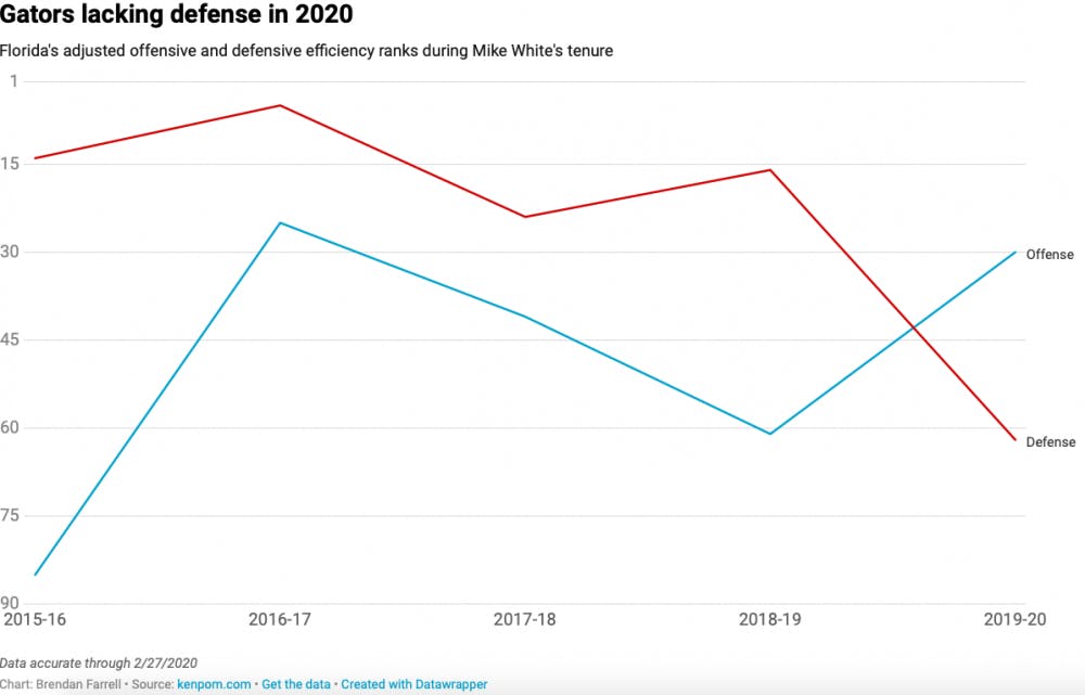 The big problem for Florida has been that its play has been very uncharacteristic of coach Mike White’s teams during his time at Florida. White’s teams have been borderline elite defensively and lagging behind offensively. This year’s edition of the Gators has been the exact opposite. Florida’s offense is the best it has been since its Elite Eight run in 2017, but the defense has fallen off a cliff.
