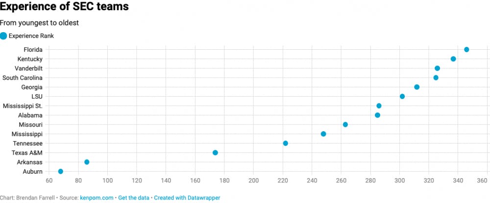 Florida is also 5–2 against the seven oldest teams in the conference, including a 69–47 drubbing of then-No. 4 Auburn, the oldest team in the SEC.