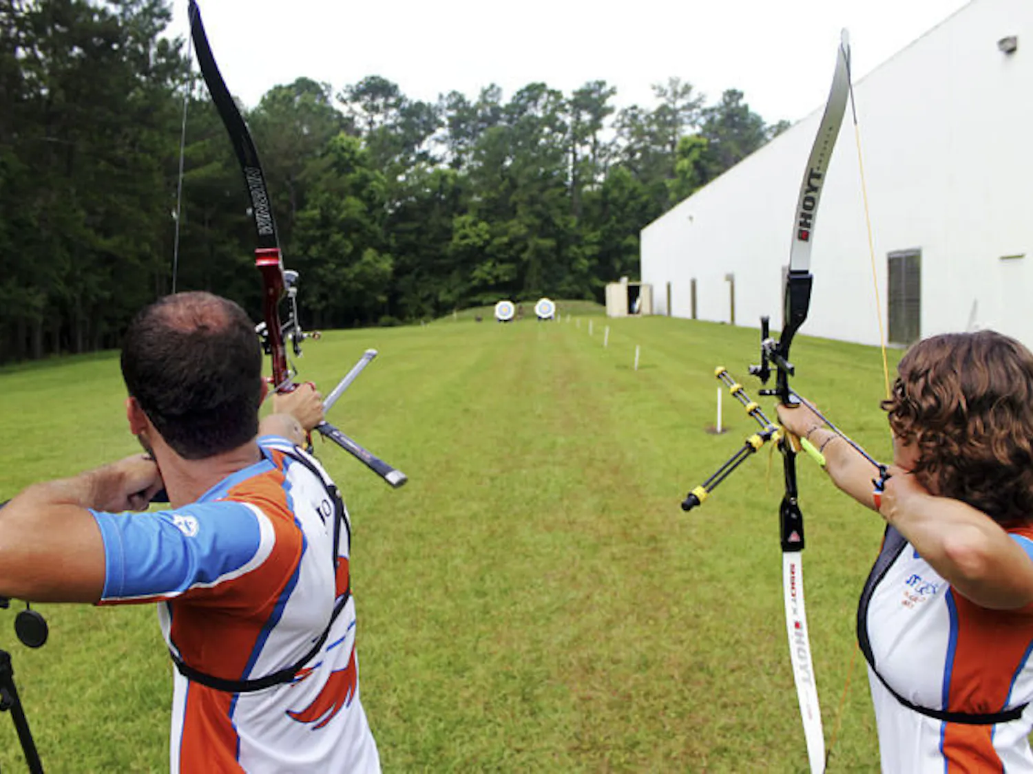 By Adam Harrington | June 2, 2014Robert Regojo and Rachel Bouchillon, a 22-year-old UF environmental science graduate student, practice on a range behind Bear Archery’s headquarters in Gainesville.