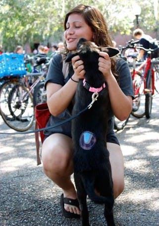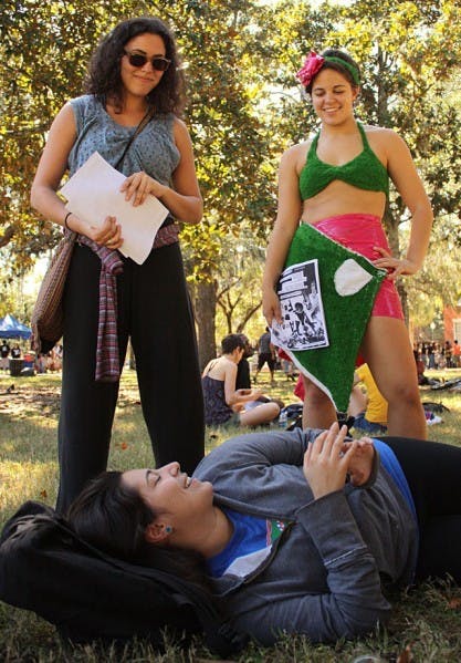 UF B.F.A dance majors Courtney Baron, 21, and Olivia Ruggieri, 20, pass out flyers at lunchtime at the Plaza of the Americas. Ruggieri dressed up as an orchid to promote the B.F.A Dance Showcase, which will take place at the Constans Theatre from Oct. 29 through Nov. 1.