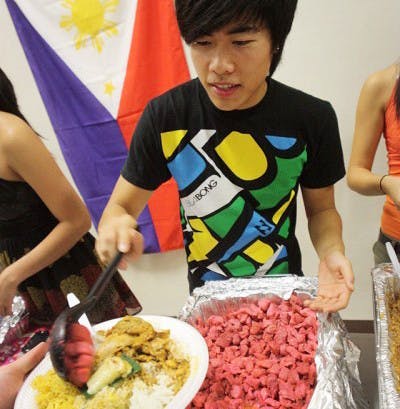 Jin Wang, 19, serves roasted red pork, a Chinese dish, at the Asian Food Festival - One Flavor. The event was held at the Indian Center of Culture and Education for Kaleidoscope Month, a celebration of Asian and Asian American culture.
