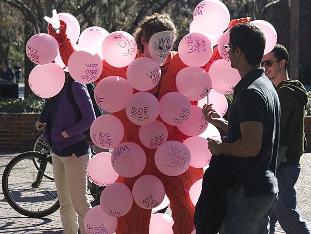 By HENRY TAKSIER | Jan. 14, 2010Patrick Wanninkhof, a UF sophomore known today as the "Water Balloon Fight Man," performs jumping jacks at Turlington Plaza on Thursday afternoon.