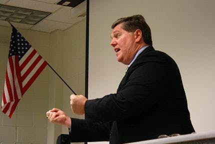 State Rep. Kurt Kelly spoke at UF Tuesday night about conservative politics and issues ranging from Obama's stimulus package to global warming.