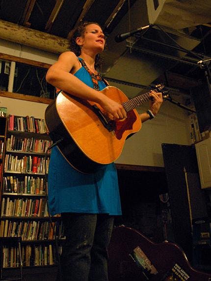 Antje Duvekot, from Somerville, Mass., sings and plays folk music on her guitar at the Civic Media Center Wednesday night